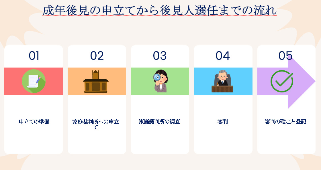 成年後見の申立てから後見人選任までの流れは、以下の通りです。