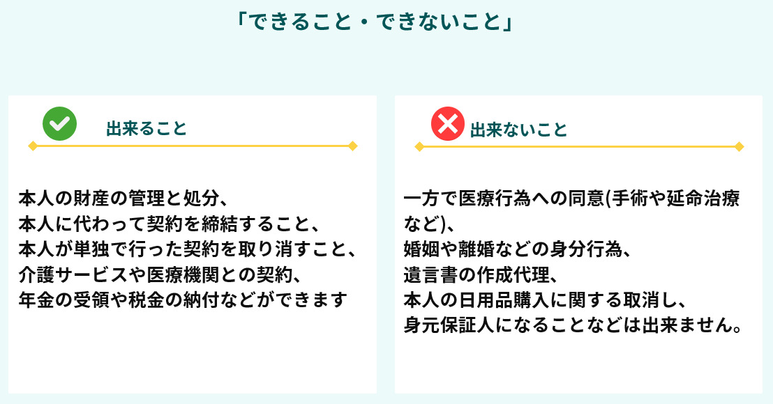 成年後見制度には「できること」と「できないこと」がありますので、確認しておきましょう。