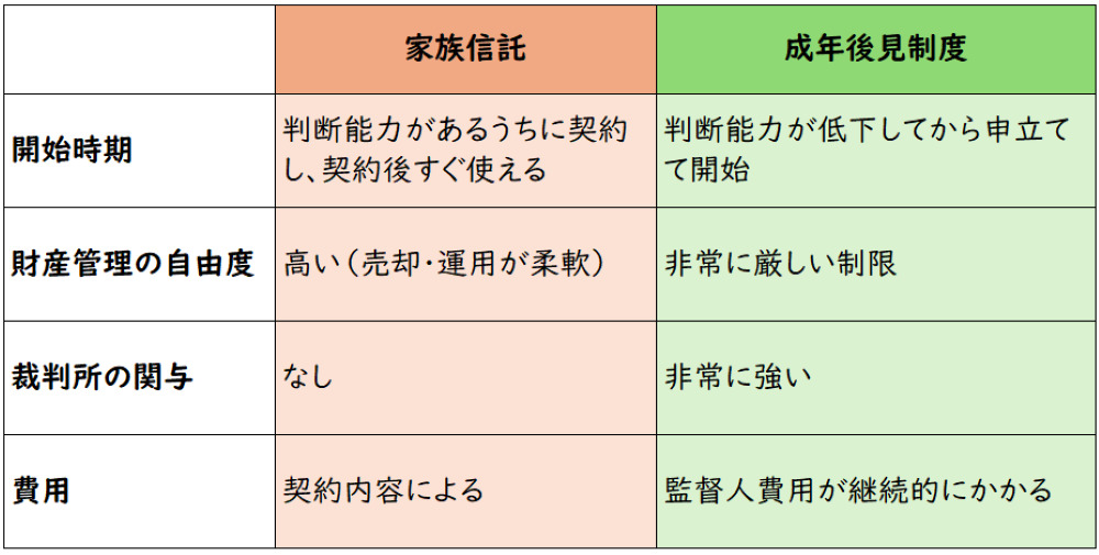 成年後見は家庭裁判所の監督下で行なう制度ですが、家族信託は個別の契約による私的な財産管理です。後見は「守る制度」、信託は「活かす制度」と表現されることもあります。