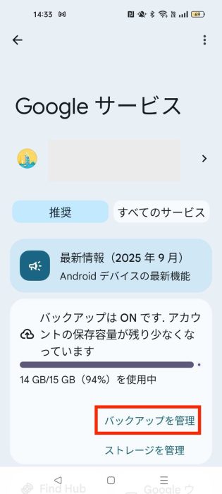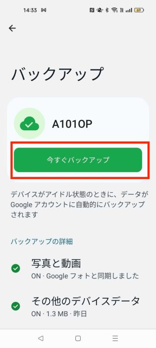 2.「Google」→「バックアップを管理」→「今すぐバックアップ」をタップします。