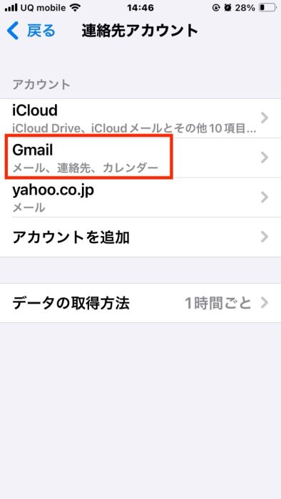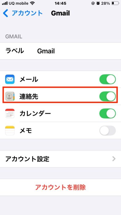 ※既にGoogle アカウントが追加されている場合は、「連絡先アカウント」→「Gmail」→「連絡先」と移動し、「連絡先」が有効(緑色)になっているか確認してみてください。