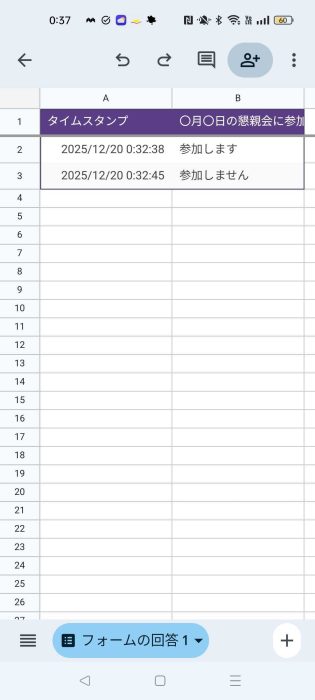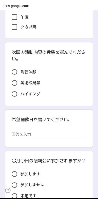 地域の集まりや防災訓練、懇親会などの参加可否を確認したい時に、Google フォームは大変便利です。紙の回覧板や電話確認に比べ、手間が省け、回答も一覧で見られます。