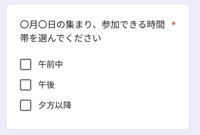 ・質問項目:「〇月〇日の集まり、参加できる時間帯を選んでください」
