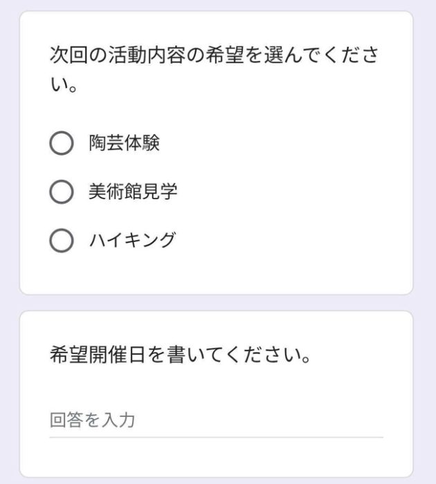 趣味の会や習い事の仲間同士で「次は何をしたいか」「どの日が都合がいいか」などの意見を集めたい時にも便利です。