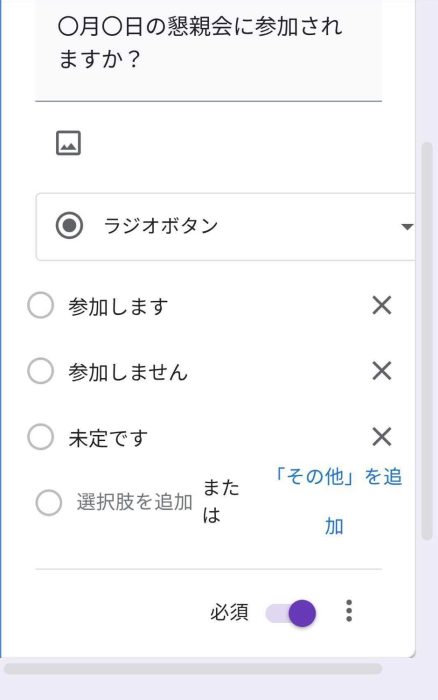 ※「ラジオボタン」は1つだけを選ぶ形式、「チェックボックス」は複数選択できる形式です。選択肢は「参加します」「参加しません」「未定です」などのように自由に入力できます。