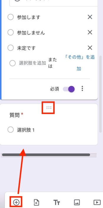 3.項目の順番を並べ替えたい時は、質問項目の上にある「グリップ」アイコンを長押しして移動させます(ドラッグ)。