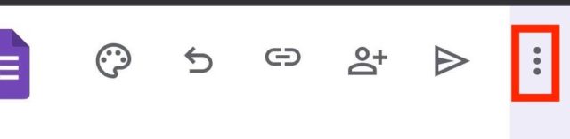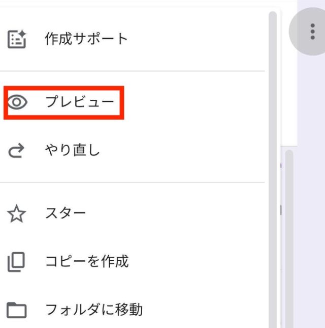 作成したフォームを送信する前に、画面右上にある縦三点リーダー(縦に並んだ三つの点のこと)をタップし、出てきたメニューで「目」アイコンの「プレビュー」をタップすると、回答者から見た表示が確認できます。
