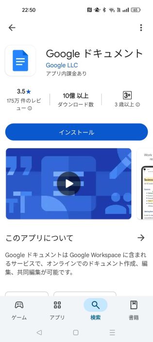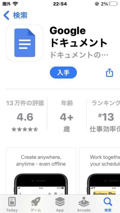 1.アプリストア(AndroidならGoogle Play、iPhoneならApp Store)を開き、「Google ドキュメント」と検索します。