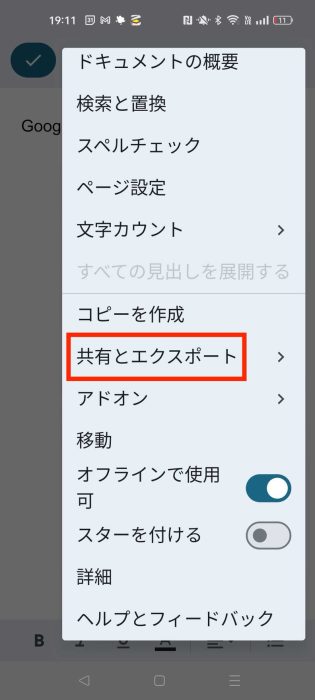 1.編集中の文書の右上にある、縦三点リーダー(縦に並んだ三つの点のこと)あるいは三点リーダー(横に並んだ三つの点のこと)をタップ、「共有とエクスポート」をタップします。