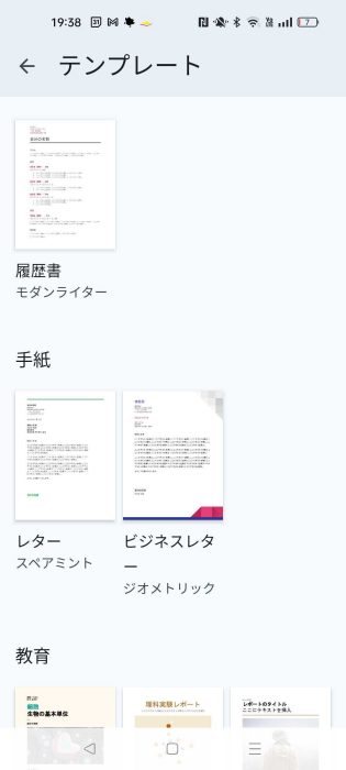 ゼロから文書を作らなくても、用途に合わせた「テンプレート」(あらかじめ整えられた書式)を選べます。ホーム画面下にある「+」ボタンを押すと、「テンプレートを選択」と表示されるので、そこから「履歴書」「プロジェクト提案書」「レポート」などの中から目的に合うものを選びます。