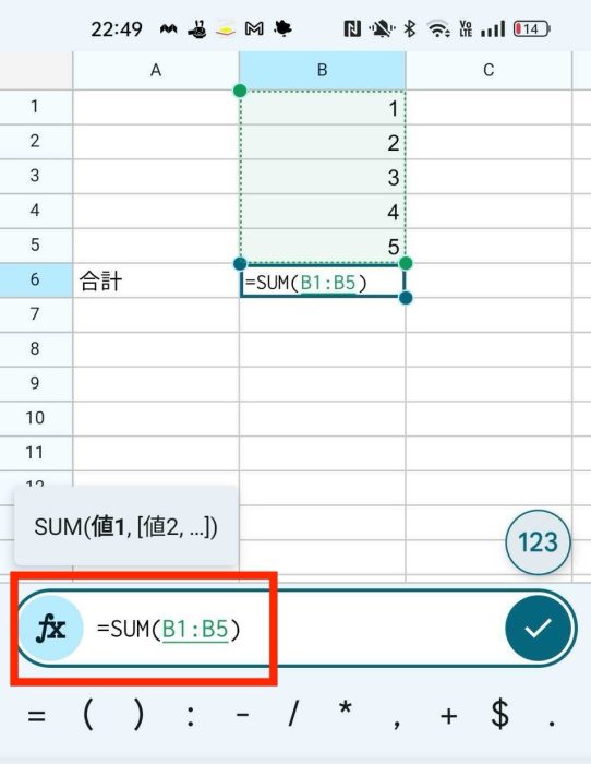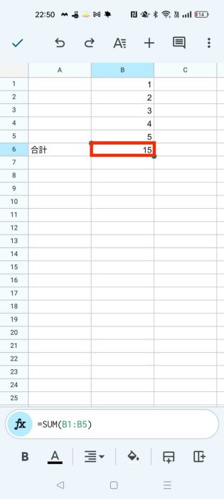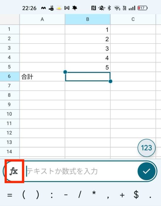 2.B6セルをタップし、画面下部のメニューから関数を表す「fx」を選択します。