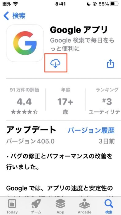 iPhoneの場合は「App Store」で、「Google」と検索して、雲のアイコンや「入手」が表示されたボタンをタップしてアプリをインストールしてください。アプリのアイコンは「G」です。