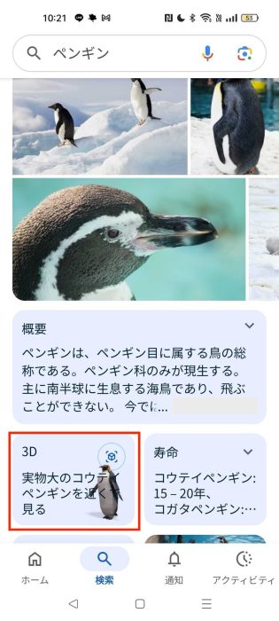 検索結果の画面を少し下にスクロールすると、「3D」という文字と動物が書かれた箇所が表示されます。ここをタップすると、画面上に立体モデルが現れます。