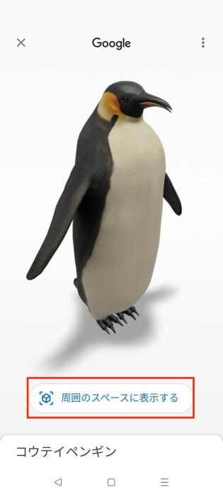 モデルは、指先で左右に回転させたり、拡大して観察したりできます。さらに、「周囲のスペースに表示する」という項目を選ぶと、現実の空間にその動物がいるかのように映し出すことも可能です。この機能は「AR」(拡張現実)と呼ばれ、スマホのカメラと連動して動きます。