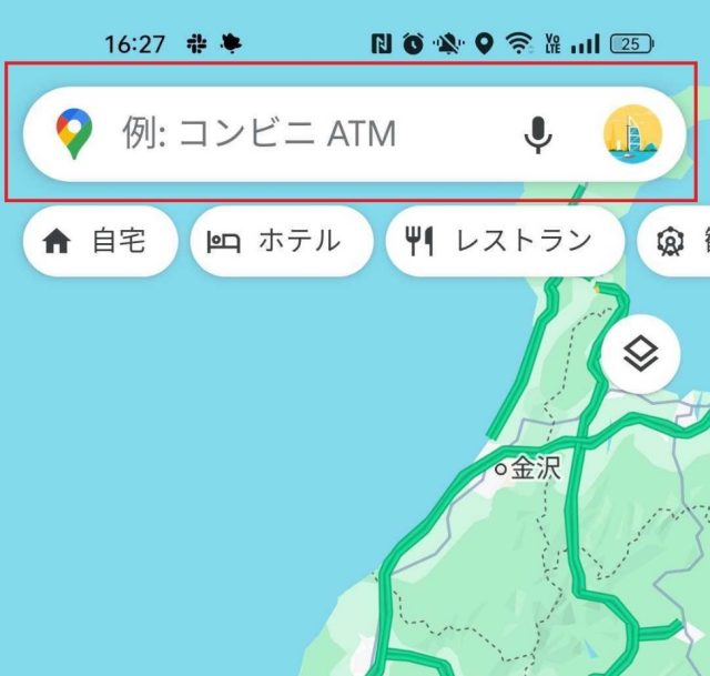 アプリが開いたら、画面上部にある細長い検索ボックスをタップしてください。そこに、行きたい場所の名前や住所を入力します。