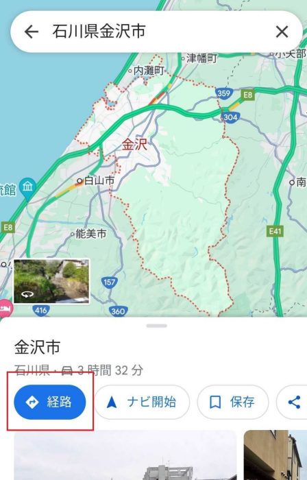 表示された目的地の画面の中に、「経路」というボタンがあります。青色で表示されていることが多く、指で押すと、今いる場所から目的地までのルートを自動で表示してくれます。