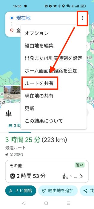 2.表示された選択肢から、「ルートを共有」をタップします。
