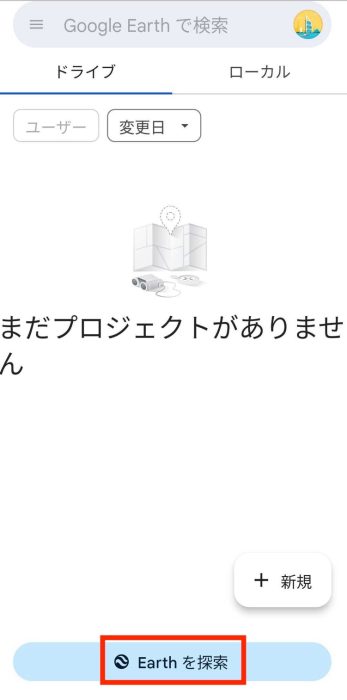 アプリを開き、画面下の「Earthを探索」をタップ後、地球全体の映像が表示されます。ここから見たい場所を探していきます。