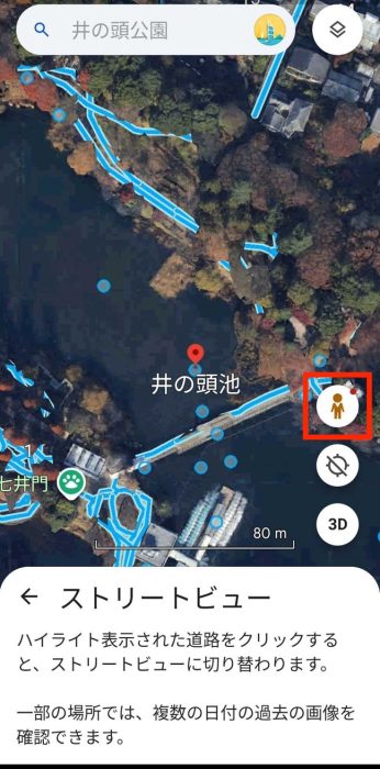 見たい場所に青い線があるか確認したら、次のステップでストリートビューを始めます。