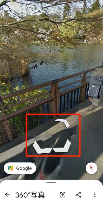 周囲の景色をぐるりと見回すことができます。画面の中心を指でなぞるように動かすと、視点がその方向に動きます。