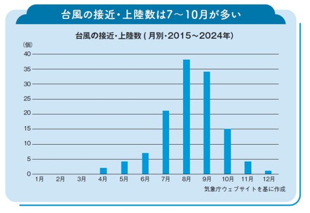 実際に、過去10年分のデータを見ても、7月から10月は接近または上陸する数が多いことがわかります。ちなみに気象庁の定義する「接近」とは、台風の中心が国内のいずれかの気象台や測候所から300km以内に入ること、「上陸」とは、台風の中心が北海道・本州・四国・九州の海岸線に達した場合を指します。