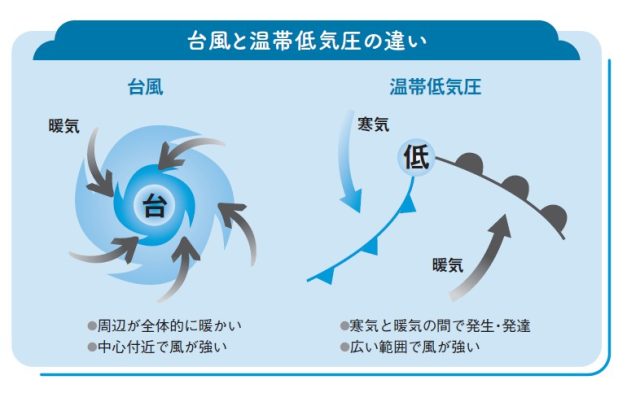 「台風は温帯低気圧に変わりました」――このように聞くと、もう大丈夫、と思う人もいるかもしれませんが、決して油断できないのです。そもそも台風とは、亜熱帯や熱帯の温かい海で発生する熱帯低気圧のうち、最大風速が17.2