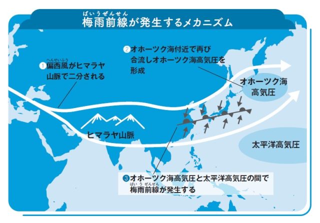 春から夏に季節が進むとき、上空を流れる偏西風は背の高いヒマラヤ山脈にぶつかり南北に分かれ、再びオホーツク海付近で合流します。この合流により強められる下降気流や冷たい海面により、冷たく湿った空気を持つオホーツク
