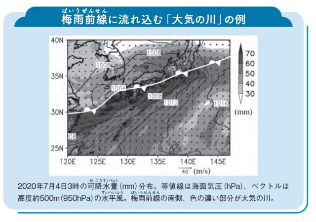だことで、令和2年7月豪雨では球磨川が氾濫するなど甚大な被害が出ました。このとき大気の川が含んでいた水蒸気を水に換算すると毎秒約40万㎥もあり、アマゾン川の約2倍に匹敵することがわかったのです。