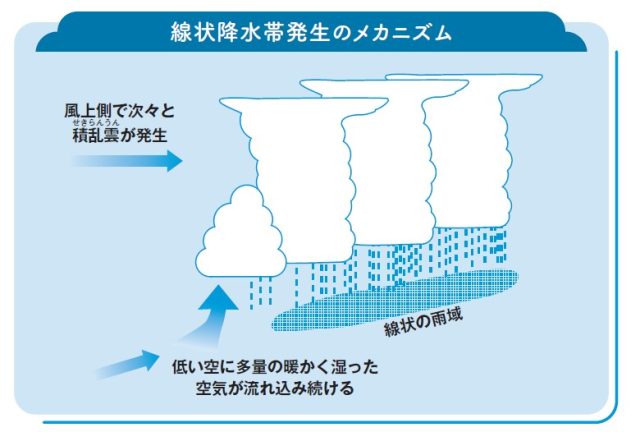 線状降水帯とは、発達した積乱雲が次々と発生して線状に伸びる雨域や積乱雲のまとまりのことで、長さ50~300km、幅は20~50km程度です。積乱雲一つの雨量は数十ミリ程度ですが、積乱雲が風上側で連なって発生すると、同じような場所で強い雨が数時間降り続き、雨量が数百ミリにも達して災害をもたらします。線状降水帯は、台風や前線より規模が小さいうえに、発生条件や維持するメカニズムに未解明な部分も多いため正確な予測が難しいですが、予測精度向上のための研究が日々進められています。
