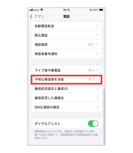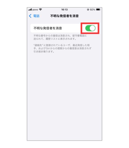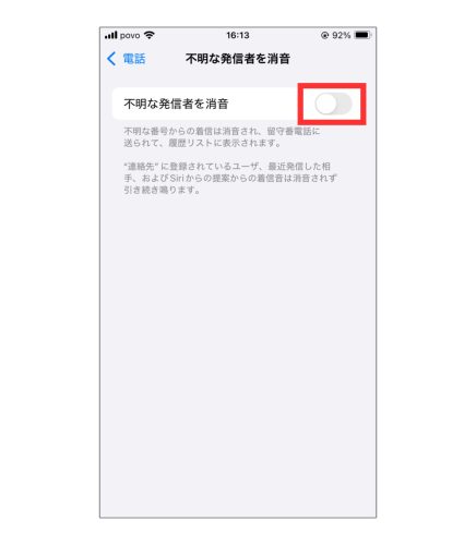 下のほうにスクロールすると「不明な発信者を消音」という項目が出てくるのでこれを押します。