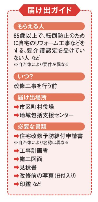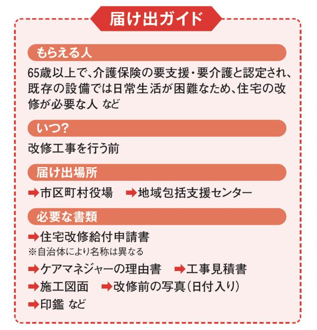 そこで、今回は『初めてでも簡単! 知って得する60歳からの「届け出」だけでもらえるお金』の中から、自宅のリフォームや改修に関する届け出についてご紹介します。要支援、要介護の認定がなくても受けられる給付もあります。予防のためにもぜひ活用しましょう。