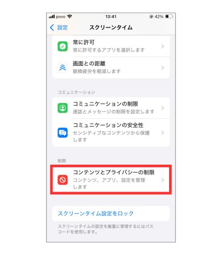 表示された項目の中にある「コンテンツとプライバシーの制限」をタップします。