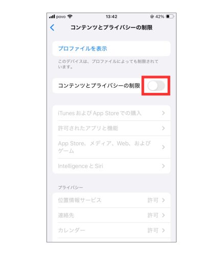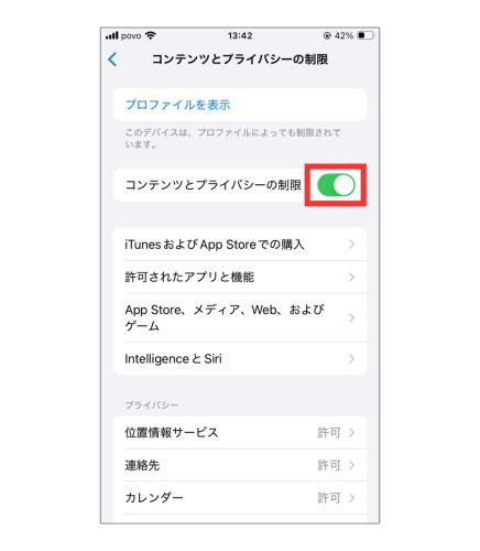 「コンテンツとプライバシーの制限」にあるスイッチを押して「オン」(緑色)にします。