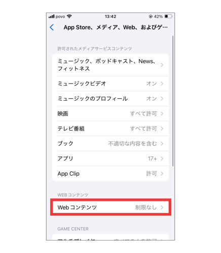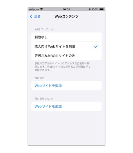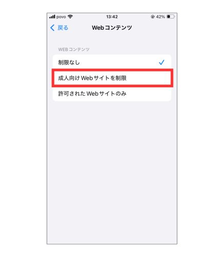 その中にある「成人向けWebサイトを制限」を選択すれば設定完了です。これでセンシティブなサイトにアクセスしても表示されなくなります。