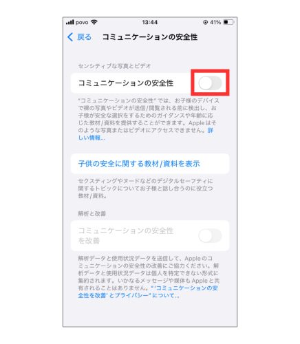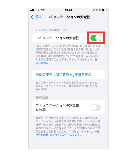 「コミュニケーションの安全性」のスイッチを押して「オン」(緑色)にすれば設定完了です。これでiPhoneのメッセージ、AirDrop、FaceTime通話や共有写真アルバムなどでセンシティブな写真やビデオが検出されたら警告を表示してくれるようになります。