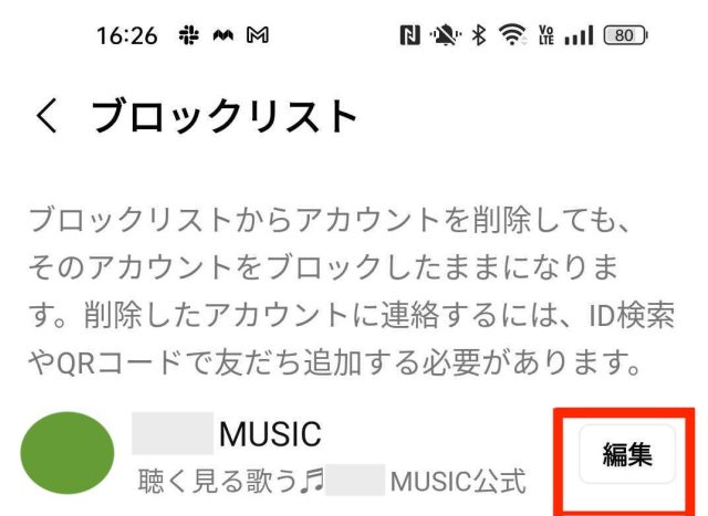 Androidでは、削除したいアカウントの「編集」をタップし、メニューで「削除」を選んでください。ブロックリストから削除されます。