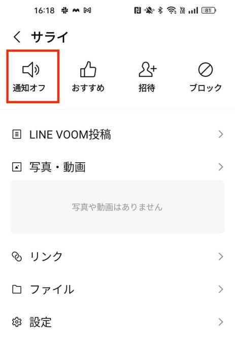 3.「通知オフ」をタップし、通知を受け取らない設定に切り替えます。なお、アイコンが「通知オン」に変わるので、これをタップすると通知は再び有効になります。安心して通知のオン・オフが可能です。