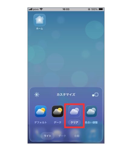すると画面下部にアイコンの色味を選択できるカスタマイズメニューが出てくるので、そこでクリアを選びます。背景が少し透けて見えるので、通常よりも背景とアイコンが馴染みやすくなります。