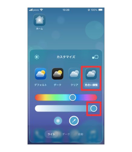 「色合い調整」を選択すると、色や彩度を調節できるので自分好みの色味のアイコンを作れます。ちなみに彩度のスライダを右側に持っていくとクリア感は少ないですが、左側に持っていくとより透明度が増します。このカスタマイズは画面のどこかをタップすると完了します。