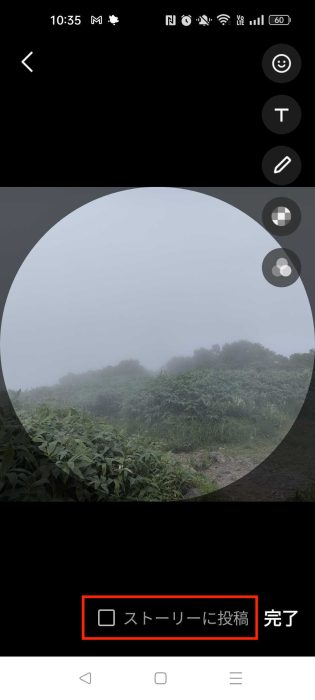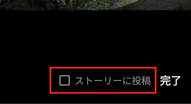6.画面下にある「ストーリーに投稿」のチェックを確認します。チェックが入っていれば、タップして外します(投稿を防ぐため)。その後、「完了」をタップして、変更は完了です。