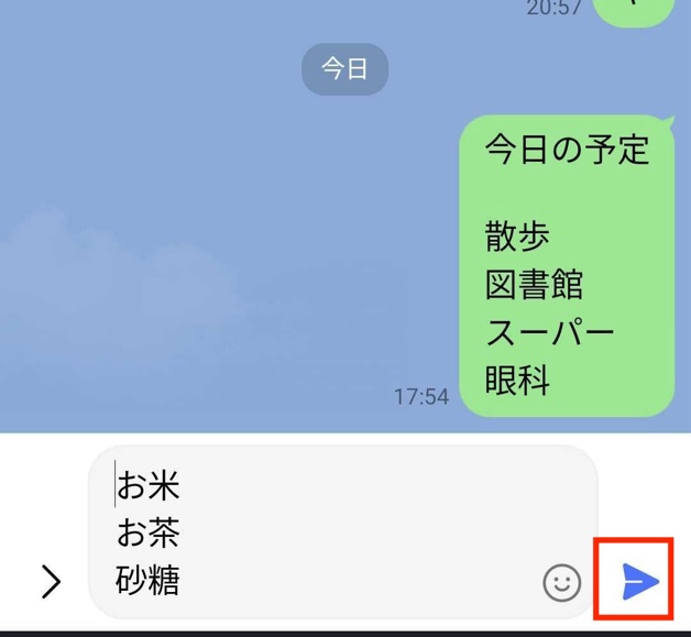 2.例えば「お米、お茶、砂糖」など、買いたい物を入力して「紙飛行機」アイコンをタップして送信します。