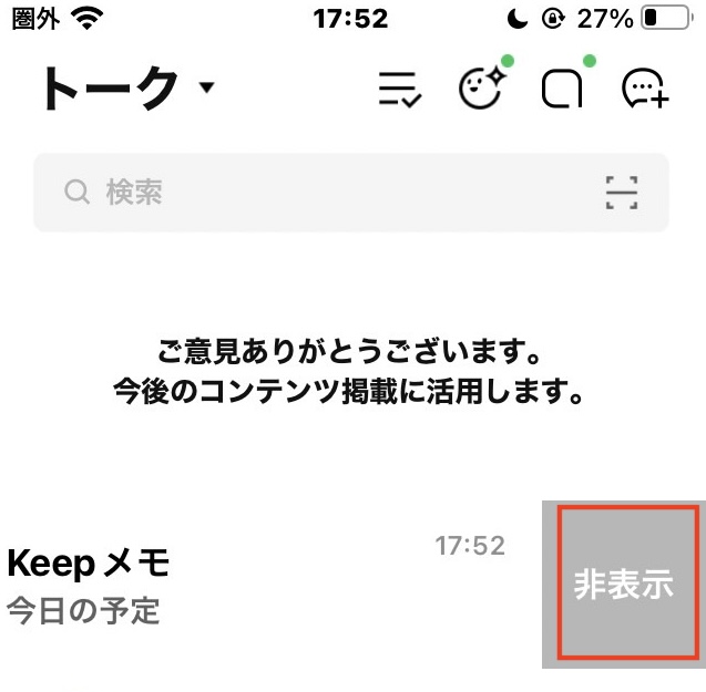 Keepメモが、トーク一覧から見えなくなってしまうことがあります。削除されたのではなく、表示の設定が原因で見えないだけの場合が多いです。