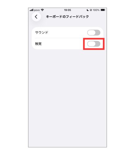「触覚」という項目の右端にあるスイッチを押してオン(緑色)にすれば設定完了です。