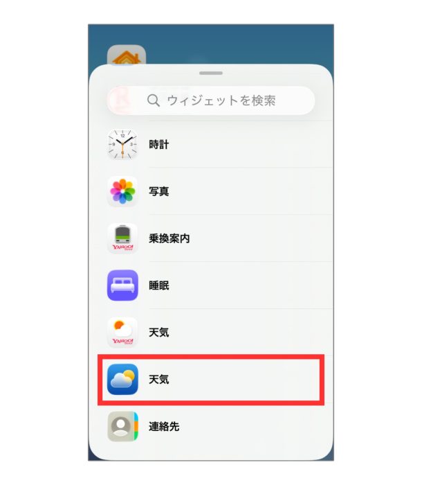 出てきたウィジェットの設定画面をスクロールすると、追加できるアプリが表示されるのでこの中から設定したいものをタップします。今回は「天気」を追加します。