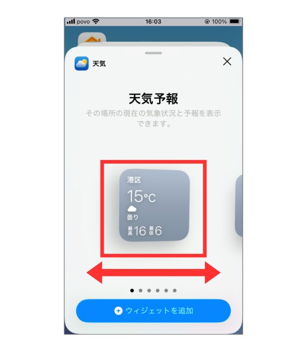 すると追加できるウィジェットの種類が複数表示されます。どんなタイプがあるか見たいときはウィジェットのサンプル部分をスワイプします。