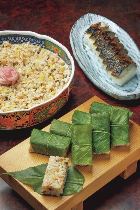 中国地方屈指の桜の名所、斐伊川(ひいかわ)堤防桜並木はJR木次(きすき)線の木次駅にほど近い。桜と暮らすこの町の伝統食、焼き鯖を混ぜ込んだバラ寿司(左上)、焼き鯖寿司(右上)、押し寿司(下)は、バラ寿司を押し寿司にして桜の葉で包んだ。