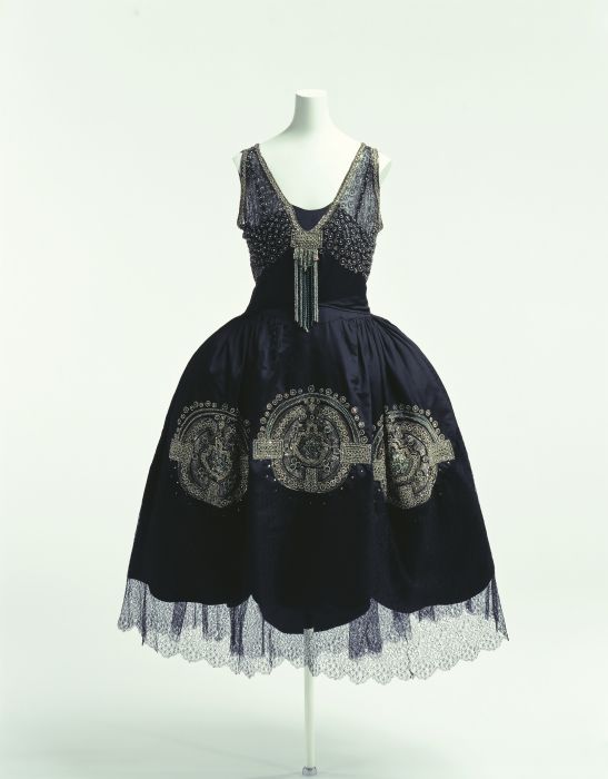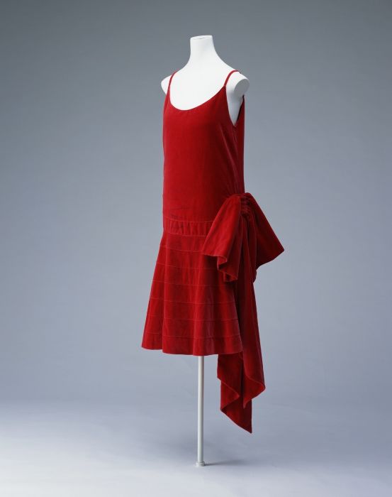 当時活躍していたポール・ポワレやジャンヌ・ランバン、またはシャネルなどパリ屈指のメゾンが生み出すドレスには、アール・デコ特有の幾何学的で直線的なデザインや細やかな装飾が散りばめられ、服の形状はウエストを絞らない簡潔なシルエットになり、長かったスカート丈はひざ下にまで上がりました。それらは古い慣習から解放され、活動的で自由な女性たちが好む新しく現代的なスタイルでした。