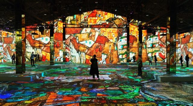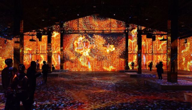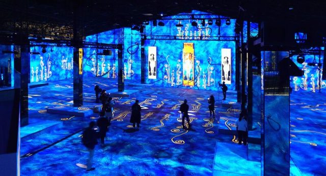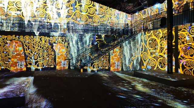 まず前半約40分がクリムトのパートです。クリムトが描いた生命、愛、死といった主要なテーマを、乱舞する色彩の世界で編み直した圧巻の構成となっていました。ヴェートーヴェンの荘厳な交響曲が空間に響くなか、直感と感情に訴えるクリムトの世界が広がり、スケール感のある没入体験が楽しめました。