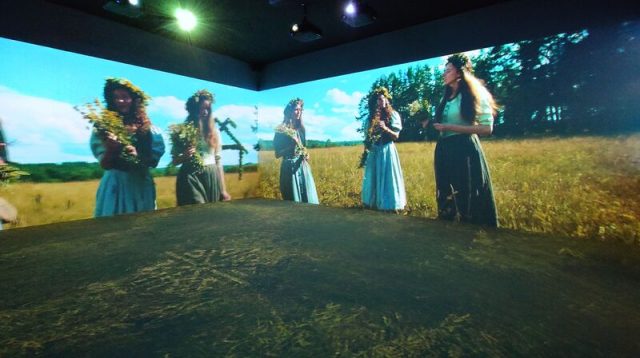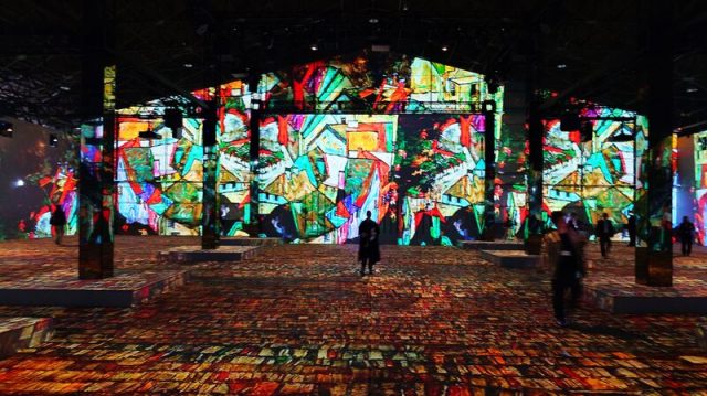 特筆したいのは、イマーシブシアターとしては国内最大級となる広大な映像空間です。もともと輸出入貨物の保管や検査などに使われていた倉庫です。その約1800㎡の巨大な内部空間を、ほぼそのままのかたちで活用。逆ホームベース型の壁面を巧みに活用しながら、迫力の映像が空間全体に広がっていました。