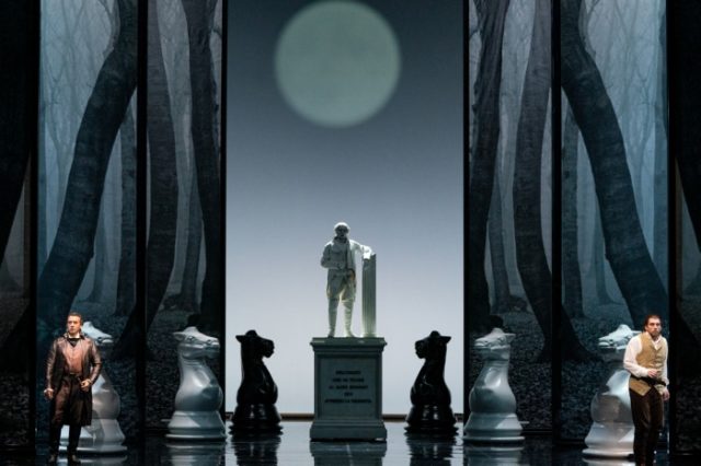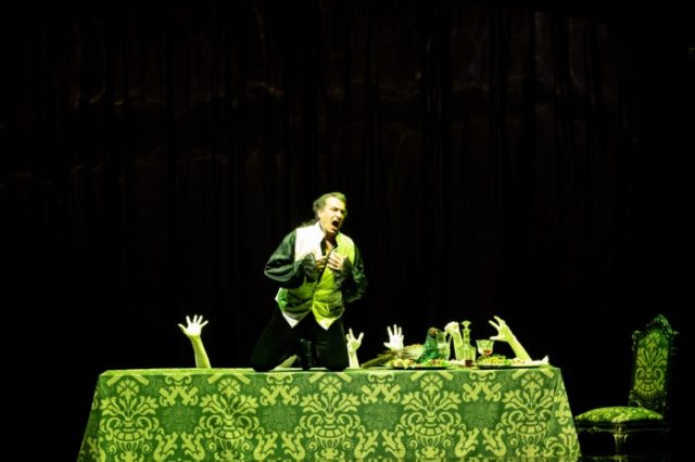 逃避行の末たどり着いた先は、騎士長が眠る墓地。そこにある騎士長の石像が突然ジョヴァンニに向かって口を開き、悔い改めるようにうながします。従者のレポレッロは震え上がりますが、ジョヴァンニは動ぜず、不敵にも騎士長の石像を晩餐に招きます。